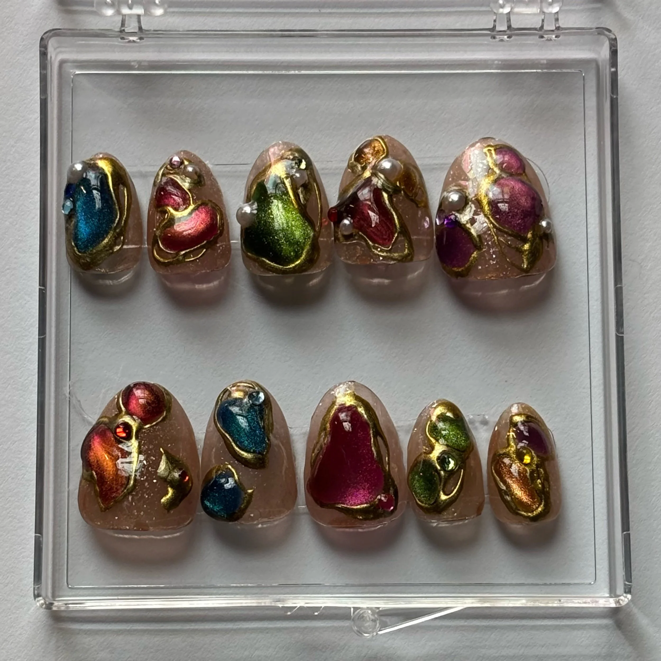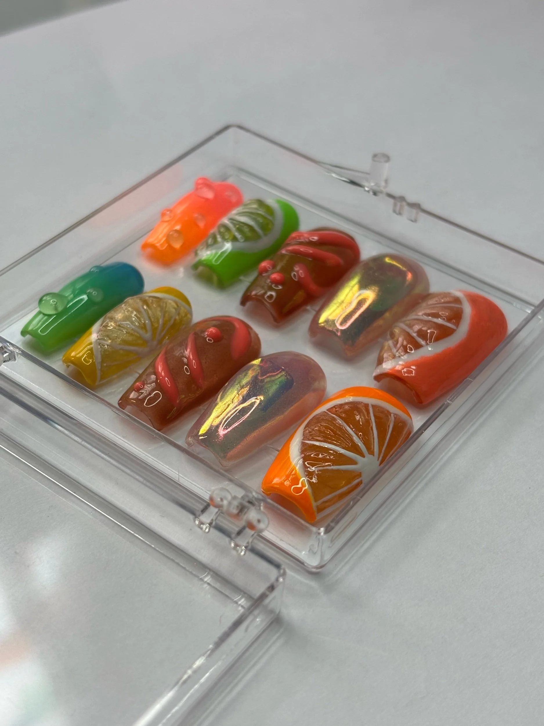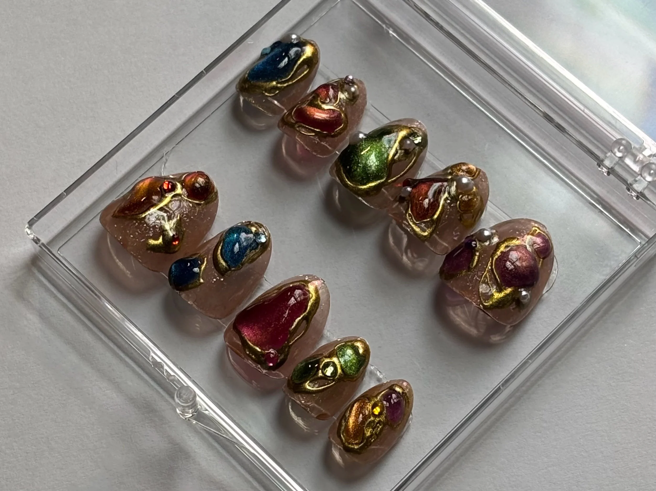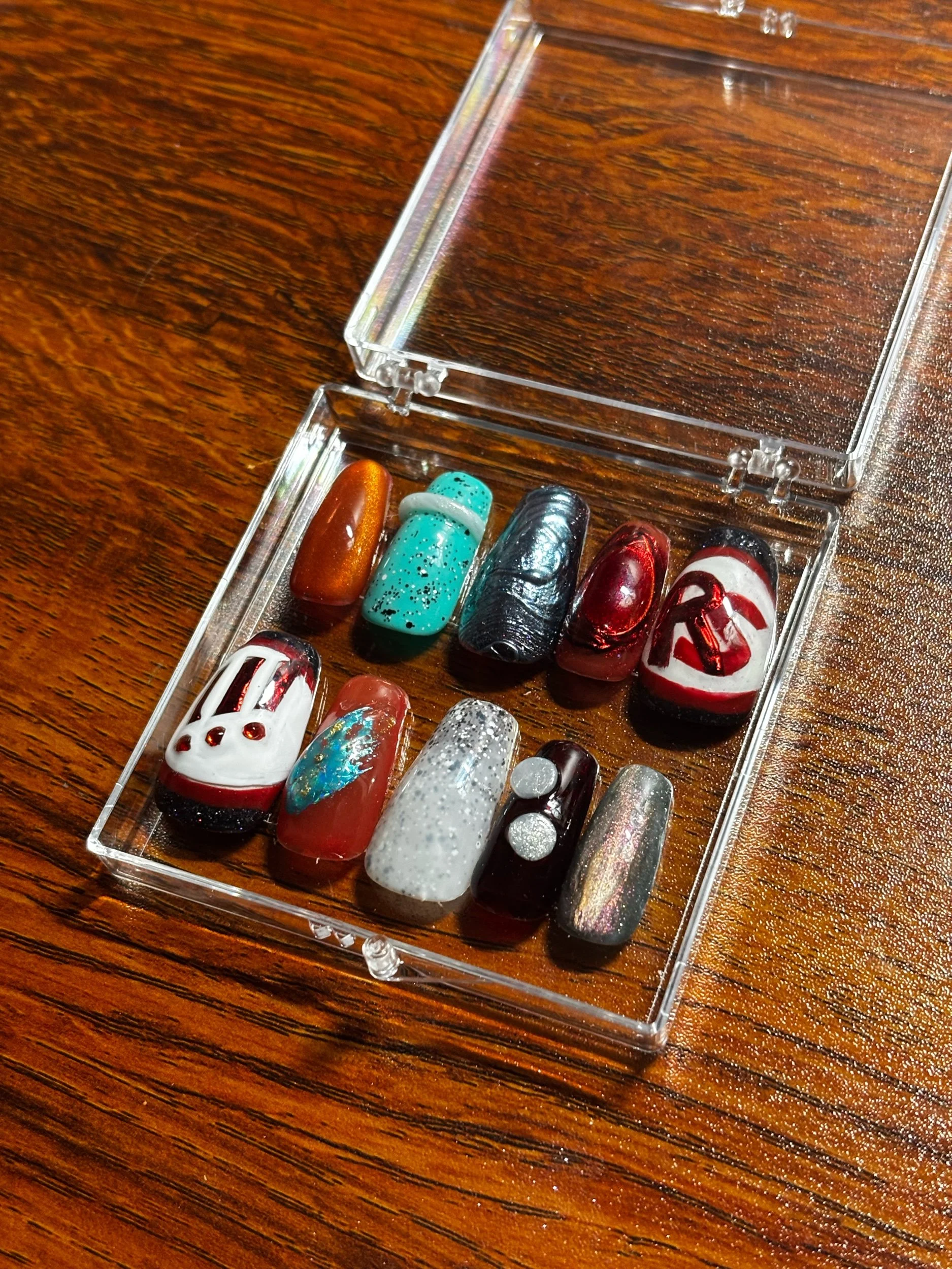 Level up your look with a set of RACY press-ons! Bold, luxe, and undeniable fun, our nail designs are sure to have all eyes on you. Whether you’re feeling funky, blingy, or a little bit risque, our hand-painted sets are designed to amplify your unique vibe.